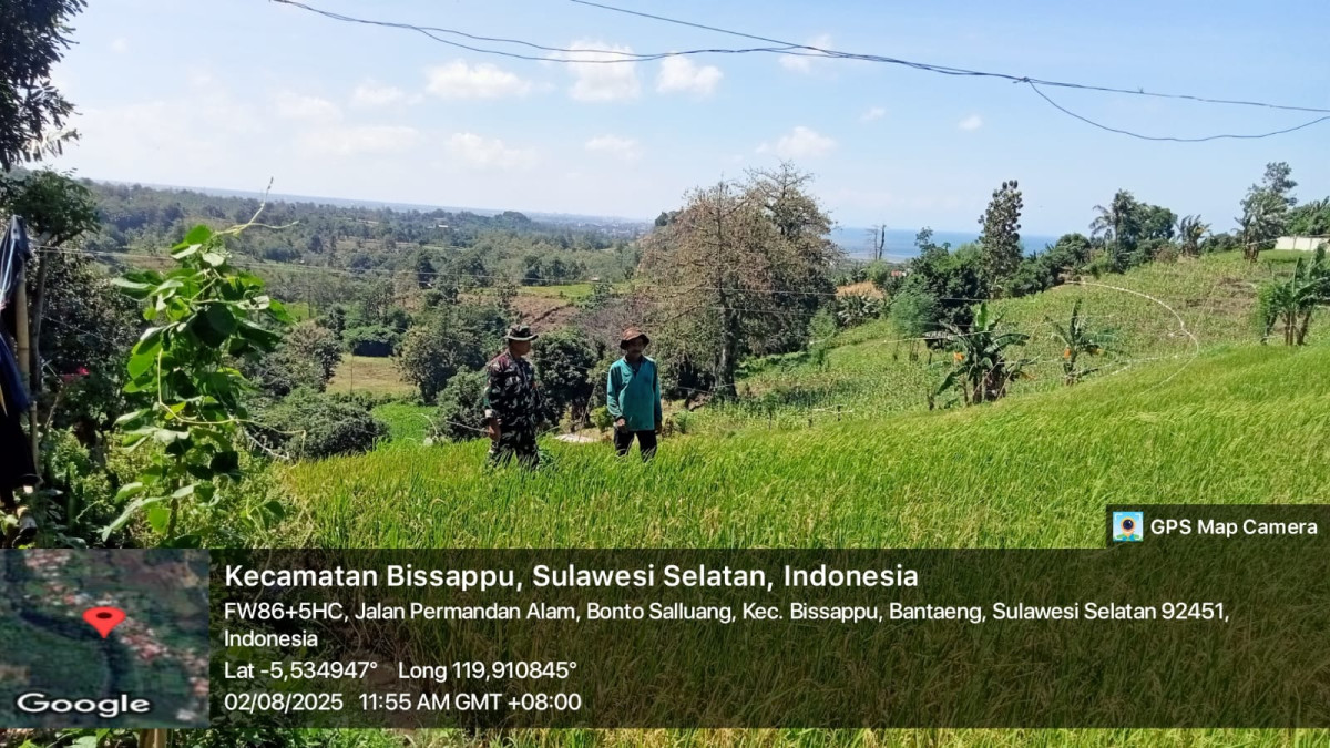Bantaeng – Dalam rangka mendukung program ketahanan pangan nasional, Serka Bahar Syam, Babinsa Desa Bonto Salluang Koramil 1410-01/Bissappu Kodim 1410/Bantaeng, melaksanakan kegiatan pemantauan perkembangan tanaman padi bersama warga Kelompok Tani (Poktan) Bonto Bossi yang diketuai oleh Bapak Dahlan. Sabtu, (2/8/2025)
