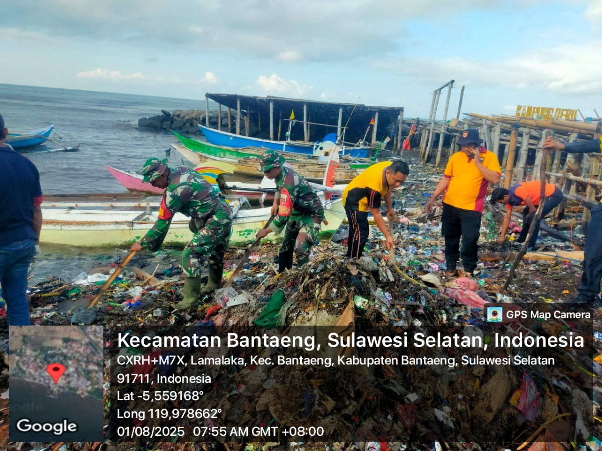Bantaeng, — Dalam rangka mendukung program kerja Kuliah Kerja Nyata (KKN) Profesi Kesehatan Angkatan ke-67 Universitas Hasanuddin, Sertu Salasing, Babinsa Kelurahan Lamalaka Koramil 1410-02/Eremerasa Kodim 1410/Bantaeng, turut serta dalam kegiatan aksi bersih pesisir di wilayah Kampung Beru, Kelurahan Lamalaka, Kecamatan Bantaeng, Kabupaten Bantaeng, Jumat (01/08/2025).